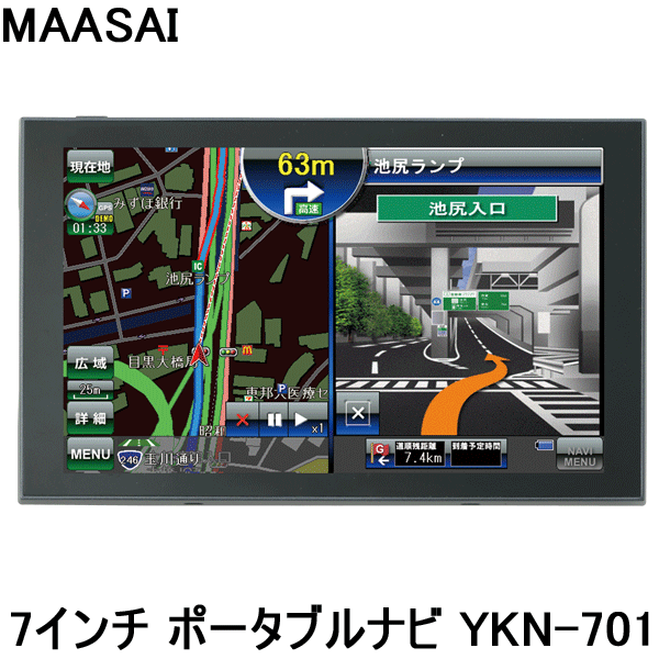 | 小型(雑貨・自転車パーツ等) メーカー MAASAI 商品名 カーナビ ポータブル 7インチ ナビ ワンセグ搭載モデル 型番 YKN-701 サイズ(約) H112×W13×L181mm 重量:255g モニター 7.0インチ(画面解像度:800×480)液晶タッチパネル採用 入力電源 DC5V(車両用) AC100V 拡張スロット microSDカード・スロット(最大サポート:8GB) スピーカー 内蔵スピーカー 音声出力端子 3.5mmステレオジャック ナビゲーション ソフトウェア Flashに内蔵 ビデオプレーヤー AVI、WMV、MP4 オーディオプレーヤー MP3、WMA 写真ビューアー JPG、BMP 電子ブックビューアー TXT 温度 動作温度:0?60度 保管温度:-20?60度 動作湿度範囲 45?80% 結露なきこと 保存湿度範囲 30?90% 結露なきこと ナビゲーション仕様 [ 地図 ] ●地図情報 全国道路ネットワーク地図 ●建物形状 約2,000万件以上 ●昼夜画面切替 昼・夜 ●ナビ中の地図回転 ヘッドアップ・北固定・3D ●地図表示操作 拡大・縮小・移動・回転 ●交通規制 一方通行矢印マーク ●縮尺切替 12段階(10m?50km) [ ルートガイド ] ●ルート検索:高速優先・一般道優先・時間優先・距離優先 ●オートリルート ●方面案内:方面看板(高速・一般道) ●レーン情報 ●トンネルアシスト ●右左折案内:表示・音声 ●3D切替表示 ●交差点拡大表示 ●到着予想時刻表示 ●目的地までの距離表示 ●目的地方向線 ●ルート一覧 ●テスト走行 ●高速道路表示 [ 検索機能 ] ●キャンプ場・道の駅検索: 約3,300(キャンプ場)+約1,000(道の駅) ●駅名・IC検索: 約15,000(駅)+約2,000(IC)+約130(空港) ●名称検索: 約60万件 ●周辺施設検索: 約60万件 ●住所検索: 約3,500万件 ●電話番号検索: 約1,000万件 ●登録地点数: 6グループ×220件+自宅 [ 登録機能 ] ●地点登録:6グループ×220+自宅 ●自宅登録 1件 ●目的地登録履歴:最大100ヶ所 主な特徴 ■登録住所数約3,500万件以上 その他にも郵便番号検索、名称検索や電話番号検索、周辺検索など幅広い検索方法により目的地の設定が可能です。 ■るるぶDATA内蔵 登録件数約59,000件!観光・宿泊・温泉地など、おでかけスポット満載! ■キャンプ場、道の駅検索モード搭載 キャンプ場約3,300件、道の駅約1,000件! ■ワンセグチューナー内蔵 自動チューニングで簡単受信! ■DC、ACアダプター対応 車内での充電の他、ご家庭でテレビを見たり、計画を立てられます。 ■タッチパネルで簡単操作 大画面7インチ、車内で見やすい映像、らくらく操作! ■トンネルアシスト機能 トンネル内でGPS受信ができない状態でも以前のGPS情報を利用して走行速度を予測して経路案内を続けます。 ■エンターテイメントも盛りだくさん! 写真閲覧、音楽再生、動画再生、計算機搭載、ゲームもできる充実のエンターテイメント機能。。 ■取付工事が不要 GPSアンテナ内蔵、自動車キットで簡単取り付け、シガーソケットに差し込むだけ! セット内容 本体 ペン シガーライターケーブル スタンド ホルダー 円盤 ACアダプター AVケーブル 取り扱い説明書 保証書 取り扱い説明書 保証書 保証期間 1年間(メーカー保証規定に基づく) ■メーカーサポートセンターが御座いますので使用方法でのご不明点、またアフターサービスでも安心です。 メーカー希望小売価格はメーカーサイトに基づいて掲載していますカーナビ ポータブル 7インチ ナビ カーナビゲーション MAASAI YKN-701
